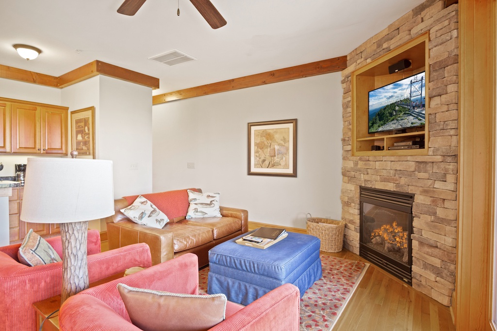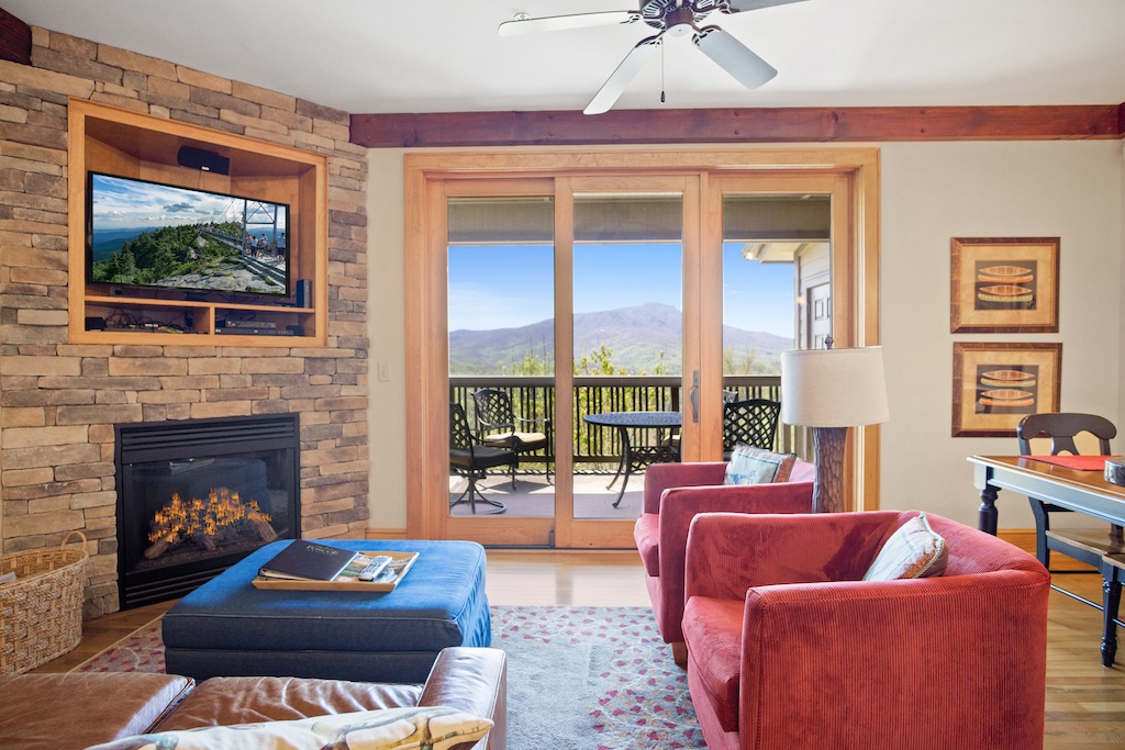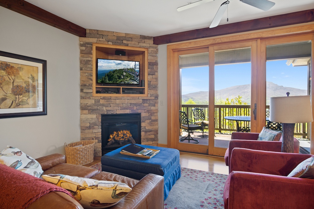 Description: Enjoy a beautiful view of mountain living from this rugged timber frame one bedroom condo located in Chalakee, within Echota Resorts. This condo features a covered front entry and rear deck with an amazing Grandfather Mountain view. The view can be admired from the deck or from the large picture windows in the open kitchen and living room areas. The kitchen features custom kitchen cabinetry, granite countertops, hardwood floors, and stainless-steel appliances. It is fully equipped with everything to prepare a meal inside or outside on the built-in-gas grill. The living room is cozy and inviting with a cultured stone gas fireplace, hardwood floors, comfortable furniture and a TV. Stay for a weekend to relax or an extended period and enjoy all the High Country has to offer. This condo is on the bottom floor (downstairs) with an elevator. In case of power outages or elevator equipment malfunctions, the condo will be stair access only.