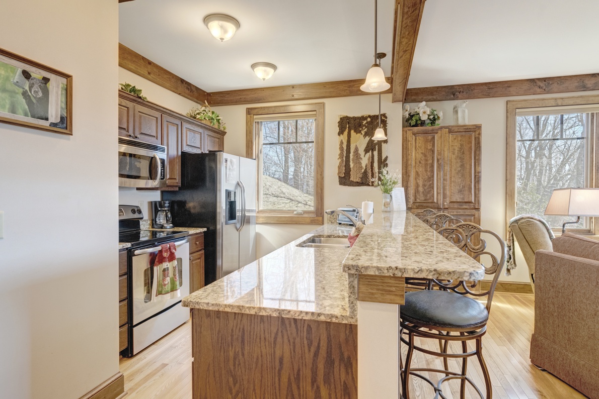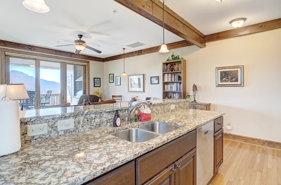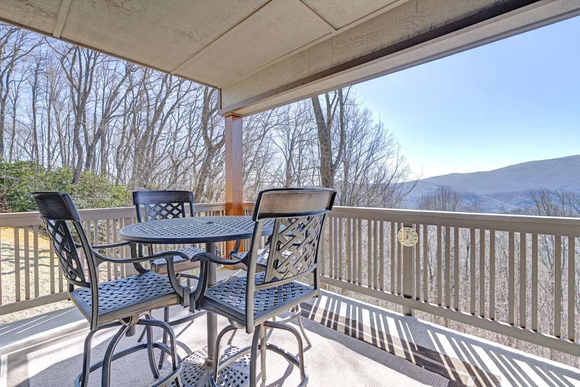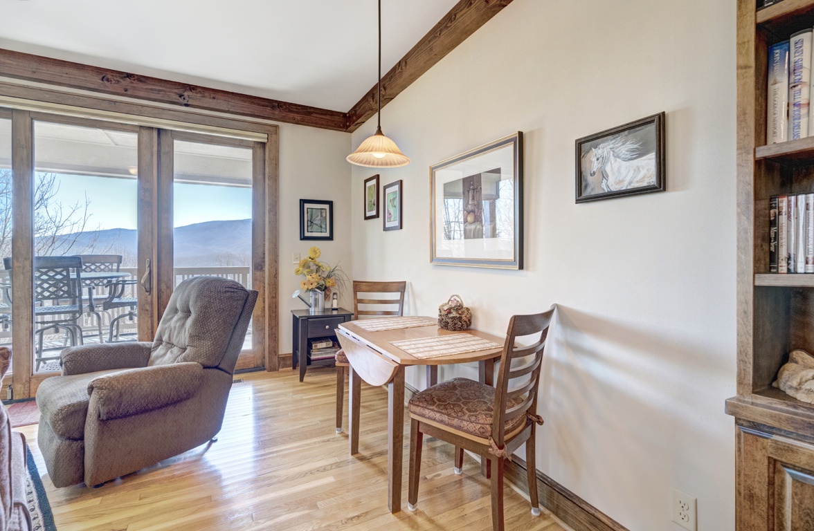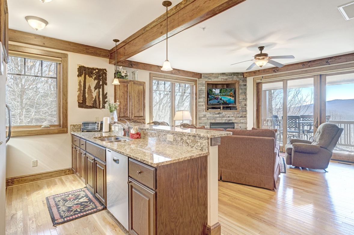 Description: Enjoy a beautiful view of mountain living from this rugged timber frame one bedroom condo located in Chalakee, within Echota Resorts. This condo features a covered front entry and rear deck with an amazing Grandfather Mountain view. The view can be admired from the deck or from the large picture windows in the open kitchen and living room areas. The kitchen features custom kitchen cabinetry, granite countertops, hardwood floors, and stainless-steel appliances. It is fully equipped with everything to prepare a meal inside or outside on the built-in-gas grill. The living room is cozy and inviting with a cultured stone gas fireplace, hardwood floors, comfortable furniture and a TV. Stay for a weekend to relax or an extended period and enjoy all the High Country has to offer. This condo is on the bottom floor (downstairs) with an elevator. In case of power outages or elevator equipment malfunctions, the condo will be stair access only.