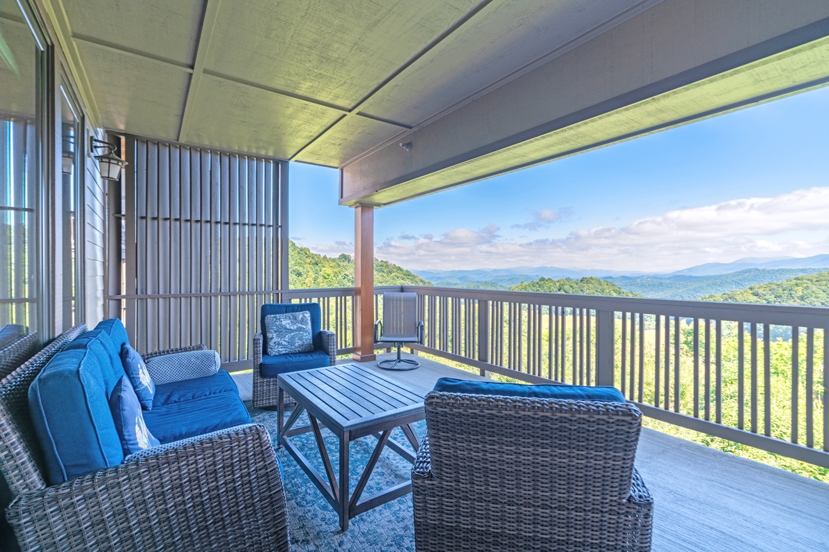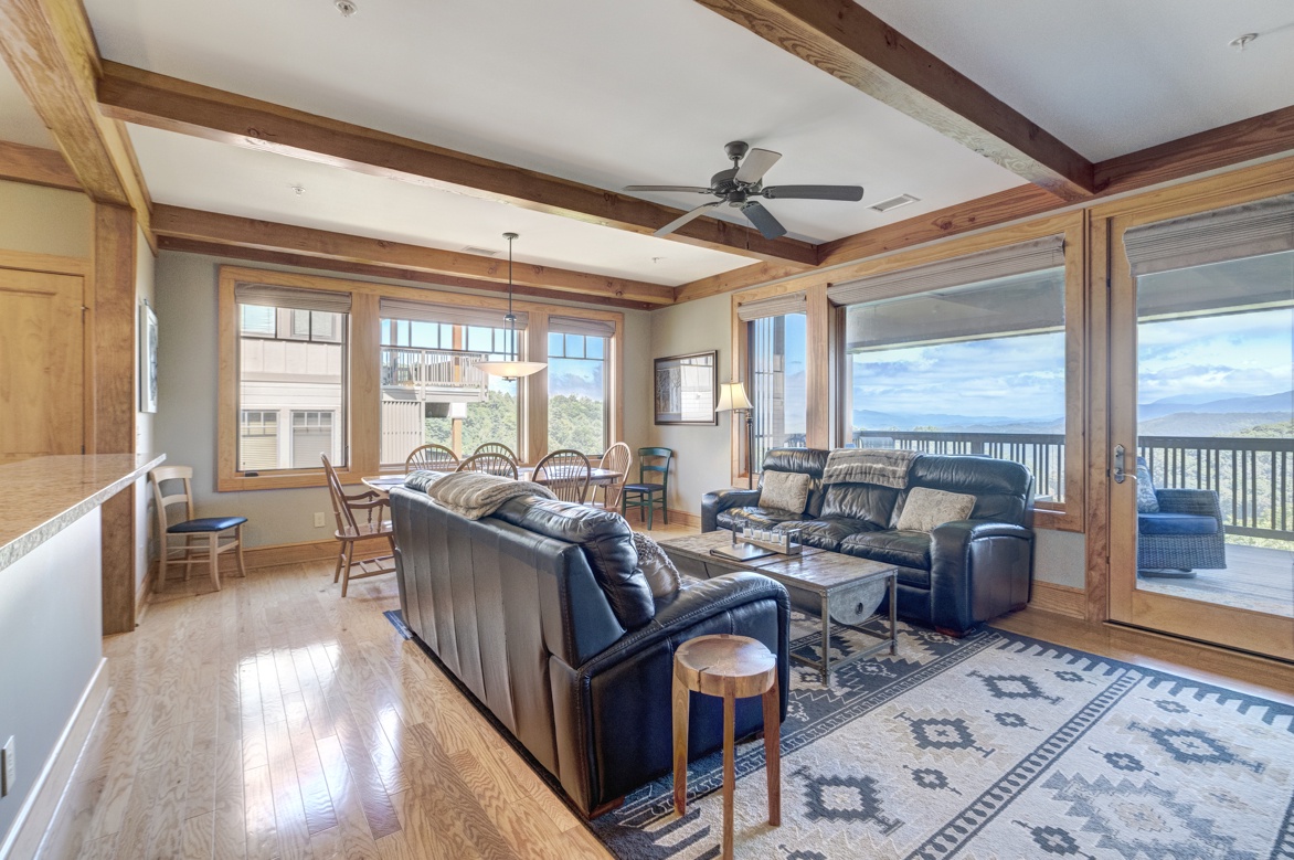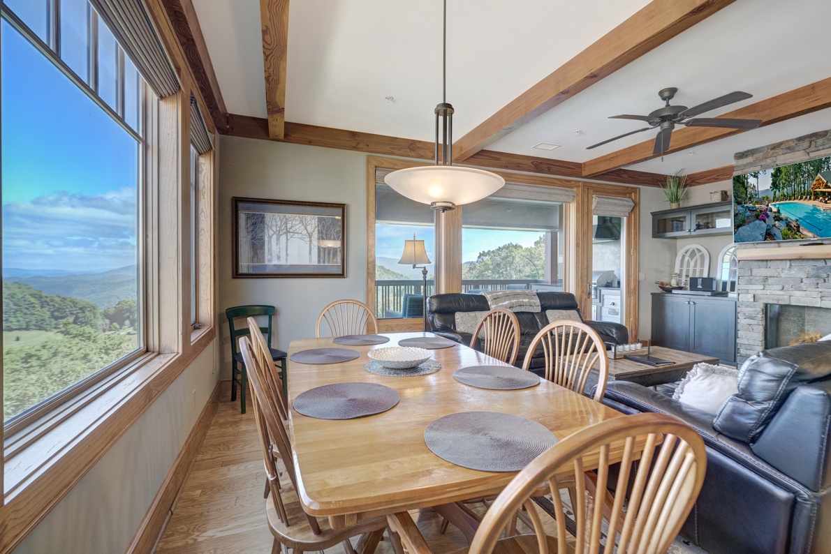 Description: Enjoy a beautiful view of mountain living from this rugged timber frame three- bedroom, three-bathroom entry-level (requiring no stairs) condo located in Chalakee, within Echota Resorts. This one-level condo features a covered front entry and rear deck with an amazing mountain view. The view can be admired from the deck or from the large picture windows in the open kitchen and living room areas. The kitchen features custom kitchen cabinetry, granite countertops, hardwood floors, and stainless-steel appliances. It is fully equipped with everything to prepare a meal inside or outside on the built-in-gas grill. The living room is cozy and inviting with a cultured stone gas fireplace, hardwood floors, comfortable furniture and a TV. The primary bedroom is spacious and inviting with a mountain view and TV. The primary bath is set up for relaxation with his and her sinks and a gorgeous tile shower. The guest rooms are spacious and beautifully decorated each with bathrooms attached. The bathrooms are upgraded with ceramic tile flooring. Stay for a weekend to relax or an extended period and enjoy all the High Country has to offer.