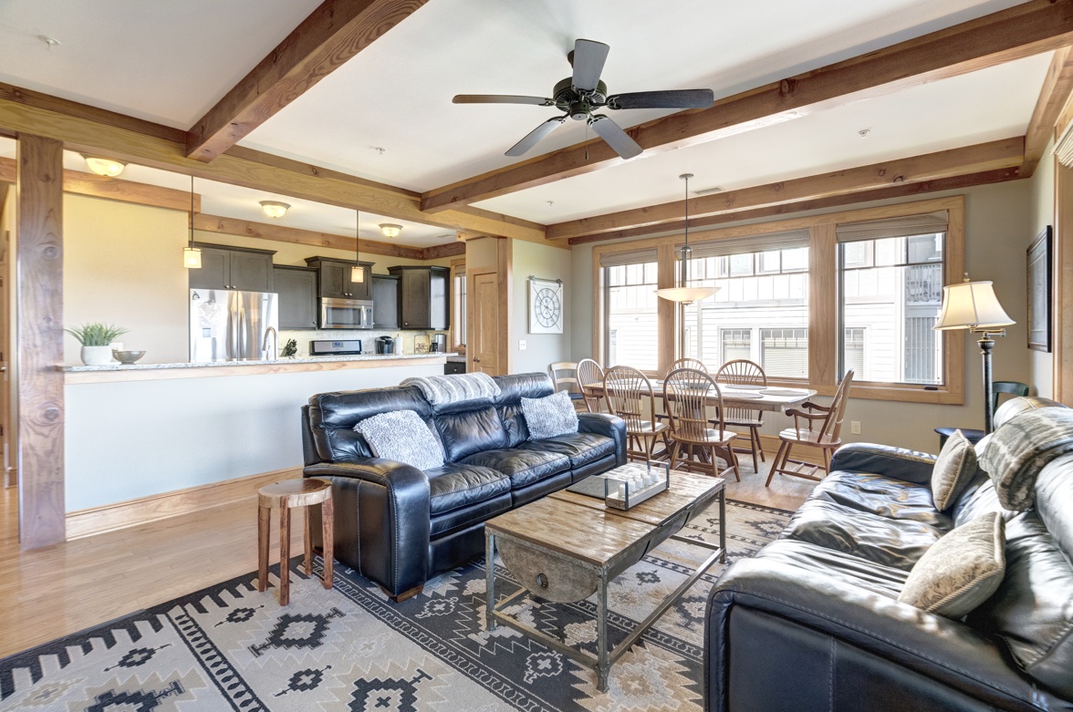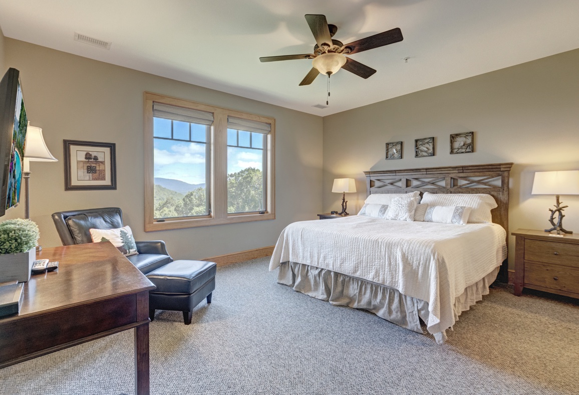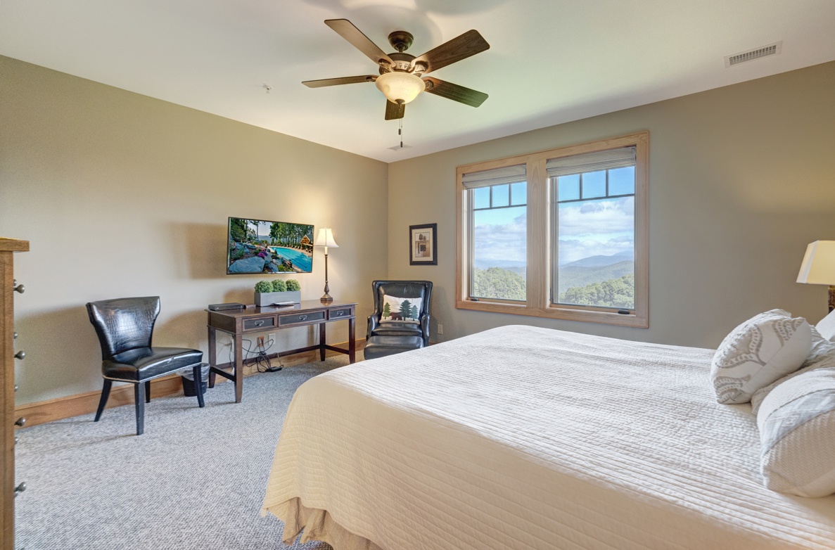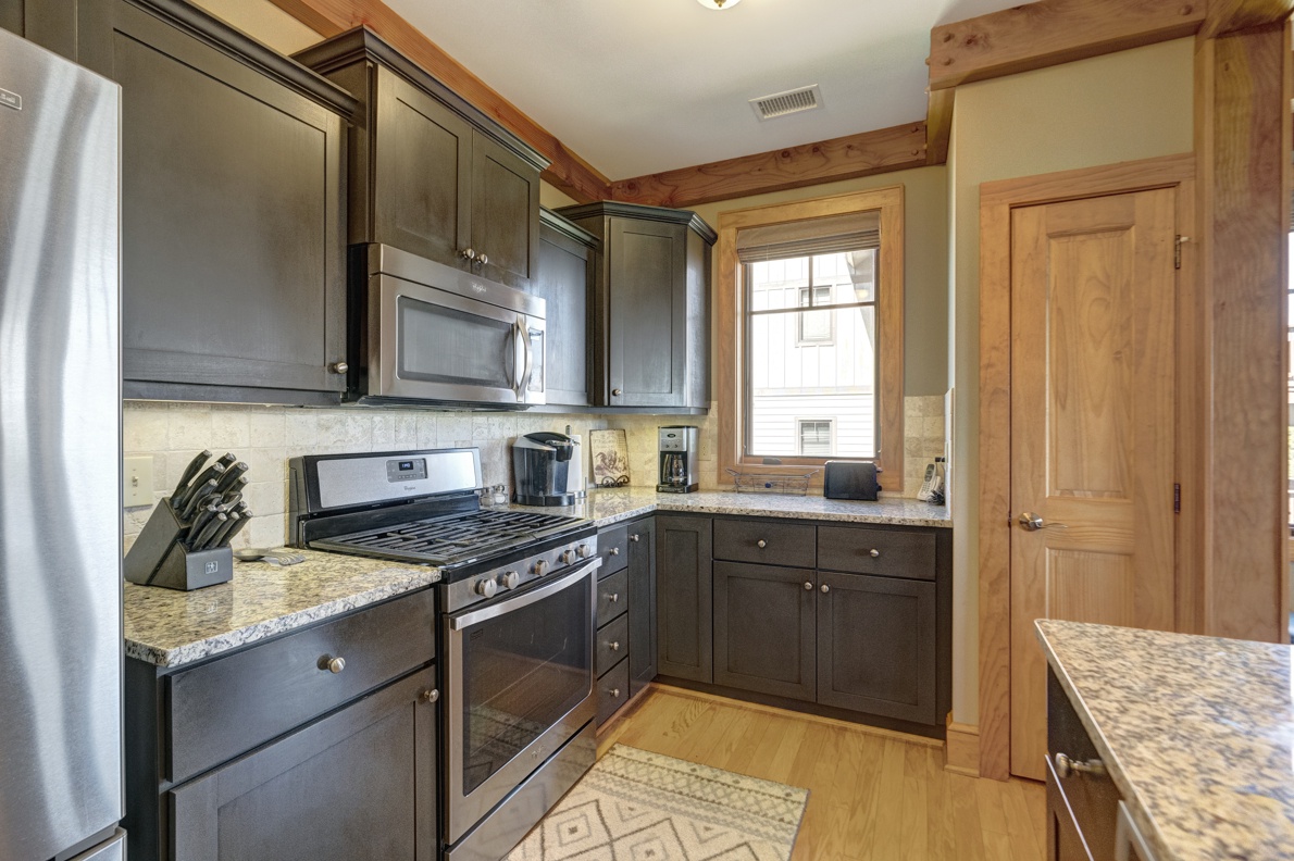 Description: Enjoy a beautiful view of mountain living from this rugged timber frame three- bedroom, three-bathroom entry-level (requiring no stairs) condo located in Chalakee, within Echota Resorts. This one-level condo features a covered front entry and rear deck with an amazing mountain view. The view can be admired from the deck or from the large picture windows in the open kitchen and living room areas. The kitchen features custom kitchen cabinetry, granite countertops, hardwood floors, and stainless-steel appliances. It is fully equipped with everything to prepare a meal inside or outside on the built-in-gas grill. The living room is cozy and inviting with a cultured stone gas fireplace, hardwood floors, comfortable furniture and a TV. The primary bedroom is spacious and inviting with a mountain view and TV. The primary bath is set up for relaxation with his and her sinks and a gorgeous tile shower. The guest rooms are spacious and beautifully decorated each with bathrooms attached. The bathrooms are upgraded with ceramic tile flooring. Stay for a weekend to relax or an extended period and enjoy all the High Country has to offer.