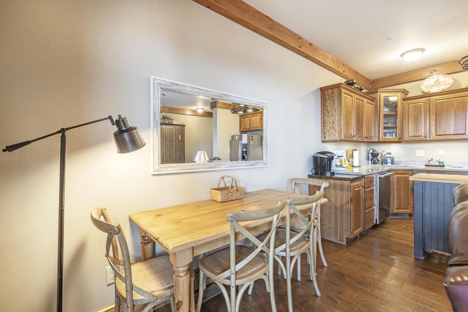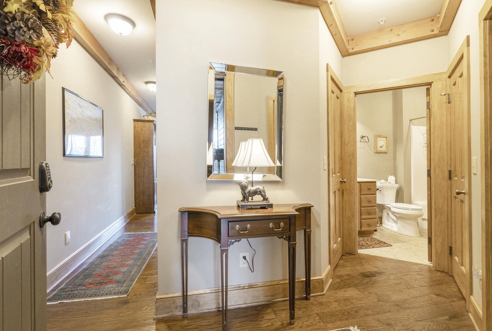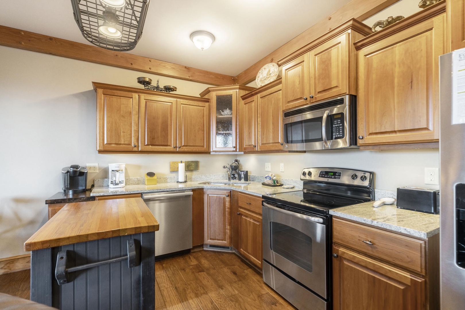 Description: Enjoy a beautiful view of mountain living from this rugged timber frame one bedroom condo located in Chalakee, within Echota Resorts. This condo features a covered front entry and rear deck with an amazing Mountain view. The view can be admired from the deck or from the large picture windows in the open kitchen and living room areas. The kitchen features custom kitchen cabinetry, granite countertops, hardwood floors, and stainless-steel appliances. It is fully equipped with everything to prepare a meal inside or outside on the built-in-gas grill. The living room is cozy and inviting with a cultured stone gas fireplace, hardwood floors, comfortable furniture and a TV. Stay for a weekend to relax or an extended period and enjoy all the High Country has to offer. This condo is on the bottom floor (downstairs) with an elevator. In case of power outages or elevator equipment malfunctions, the condo will be stair access only.