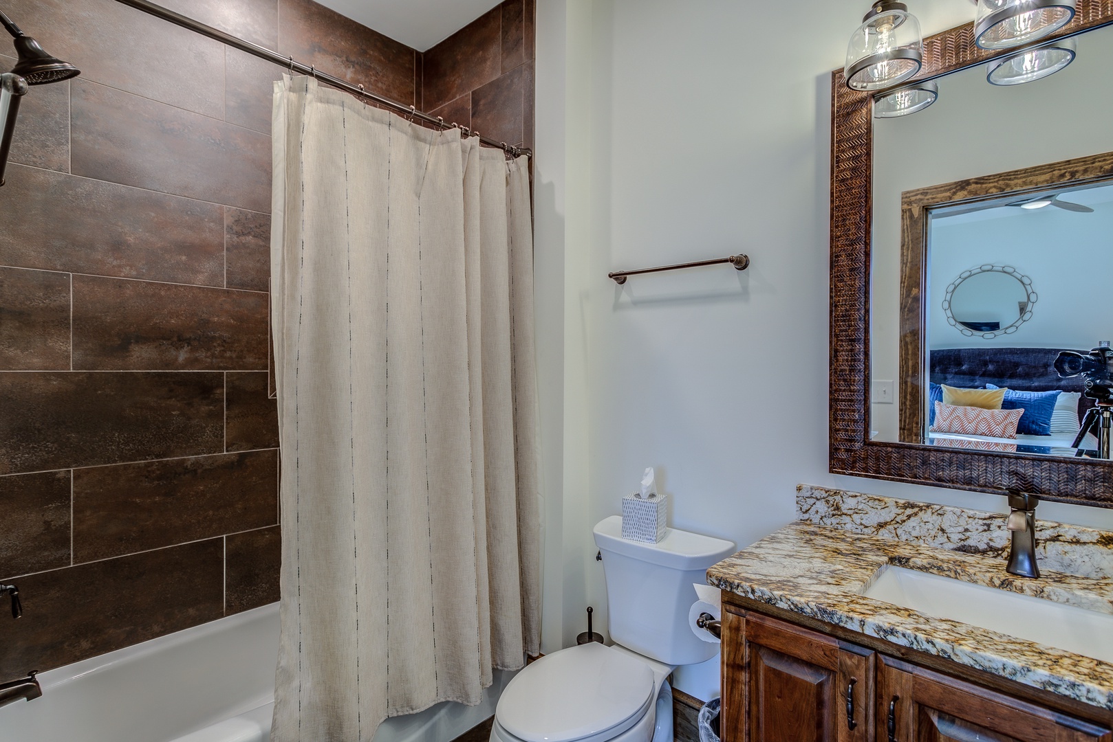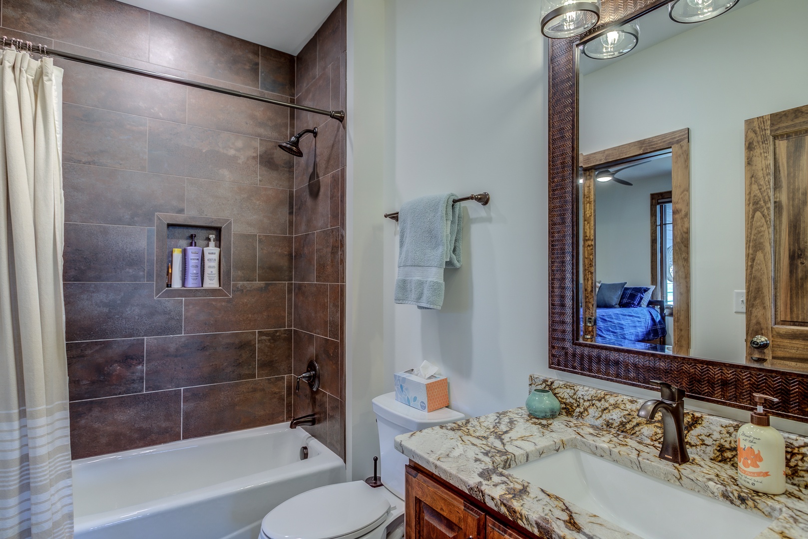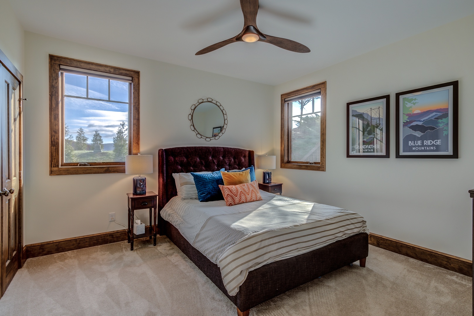 The spacious primary bedroom offers mountain views, a TV, and an inviting atmosphere. The attached primary bath is a luxurious retreat, complete with his and her sinks and a beautiful tile shower with grab bars and a bamboo shower bench. Both guest rooms are generously sized and decorated with charm, each with an en-suite bathroom that includes upgraded ceramic tile flooring.