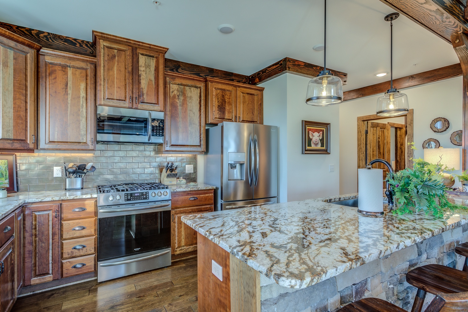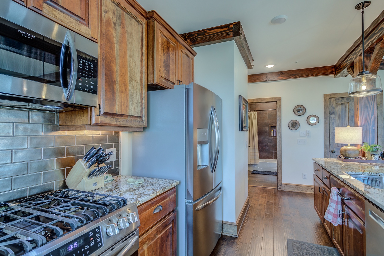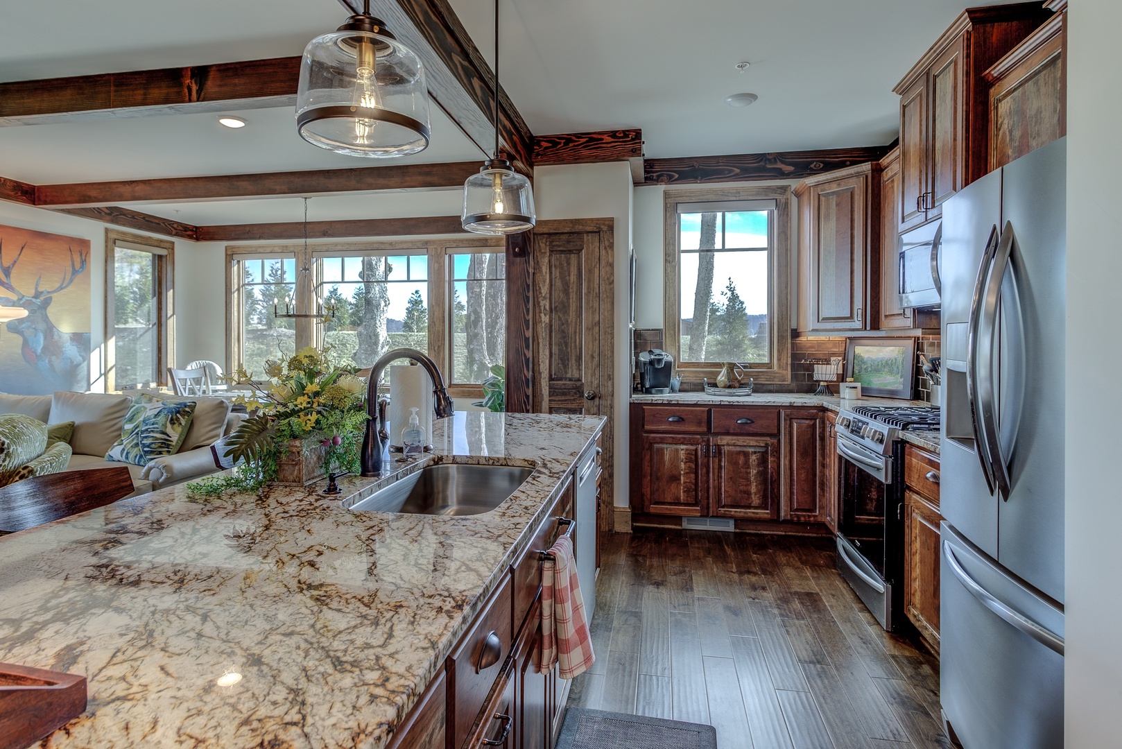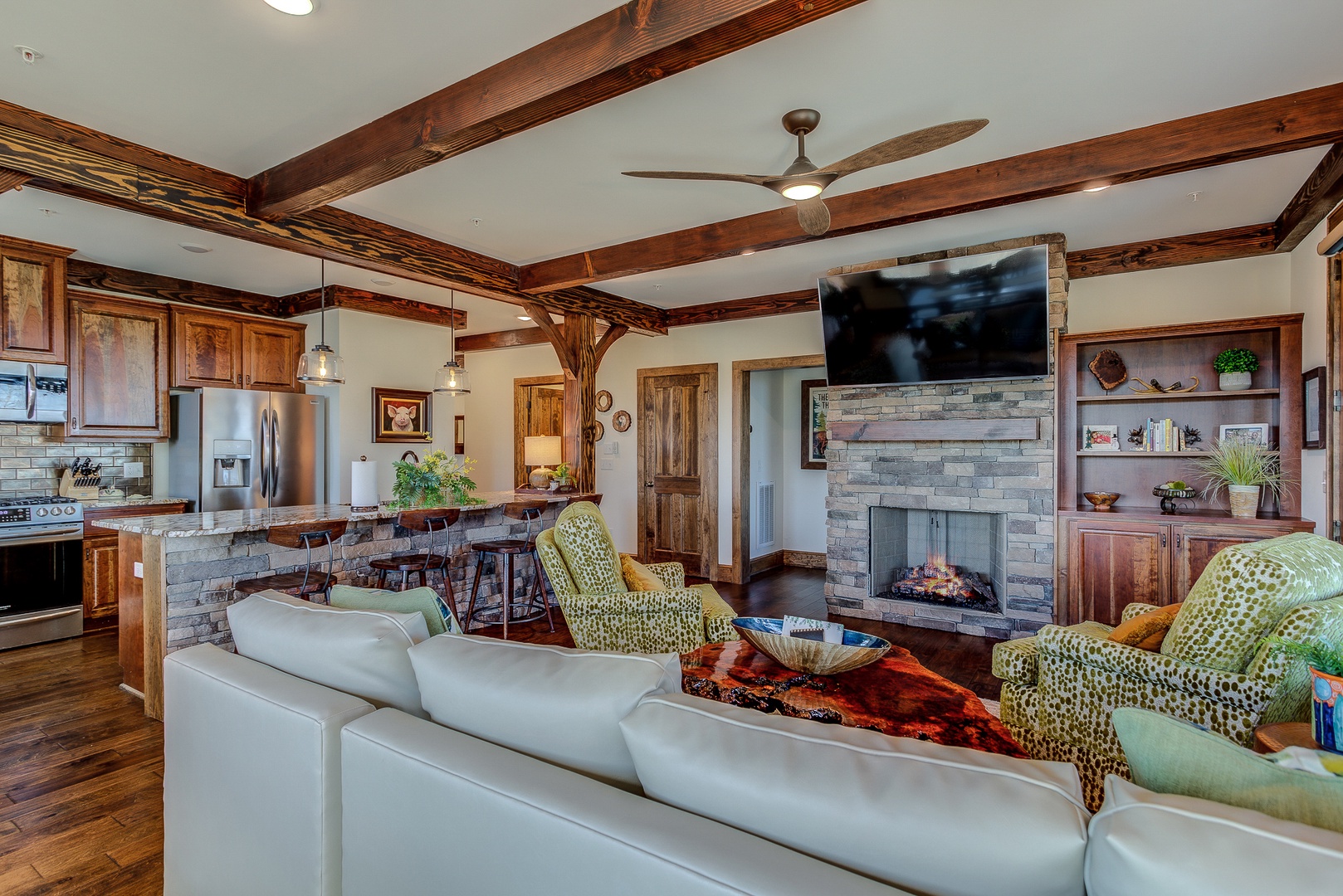 The condo’s kitchen is designed for both convenience and style, featuring custom cabinetry, granite countertops, stainless steel appliances, and hardwood floors. It is fully equipped for meal preparation, whether indoors or outdoors with a built-in gas grill on the deck. The living room is cozy, with comfortable furnishings, a TV, and a cultured stone gas fireplace, creating the perfect space for relaxation.
